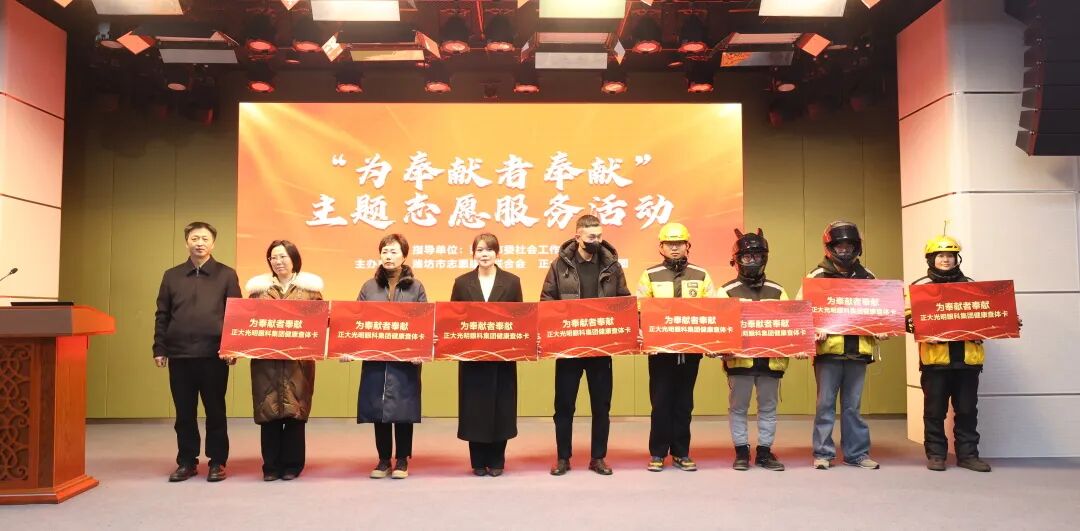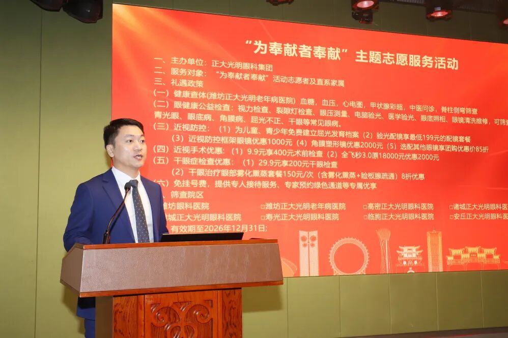正大光明眼科集团总院长孙先勇向志愿者代表送上定制化眼科查体套餐卡。据悉,此次1000张查体卡,可在潍坊眼科医院、高密正大光明眼科医院、诸城正大光明眼科医院、潍城正大光明眼科医院、寿光正大光明眼科医院、安丘正大光明眼科医院、临朐正大光明眼科医院及潍坊正大光明老年病医院8家院区使用。