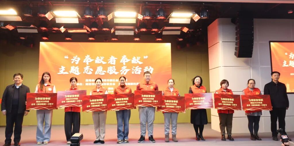 接下来,潍坊市融媒体中心要闻政论部主任、报纸板块管理团队成员高文、正大光明眼科集团总院长孙先勇,共同为潍坊市志愿服务项目大赛获奖项目负责人代表、市志愿服务联合会会员单位代表赠送2026年度《潍坊晚报》订阅卡,本次活动共送出75份报纸订阅名额,为志愿者们送上优质精神食粮,丰富其文化生活。